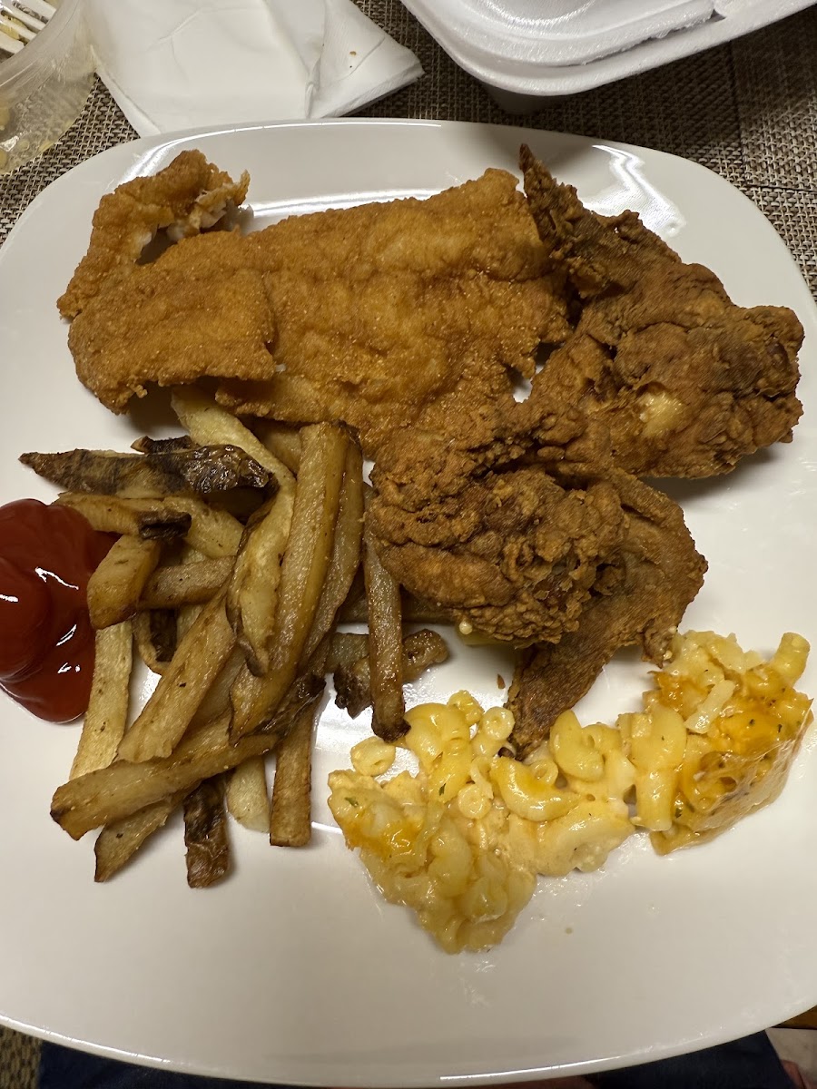 “ We have been hearing a lot about this place so we decided to phone in an order. I tried to order online only to find out that online ordering isn’t available, that’s why they got 4 instead of 5 stars. The food was great! We ordered the large catfish and wing combo fried hard with a side Mac & cheese. My wife and I split it and we still have leftovers. The seasoning was amazing, the chicken and fish were crispy too. I might go back tomorrow. I was disappointed they didn’t have any peach cobbler with extra crust so I do have to return. ”